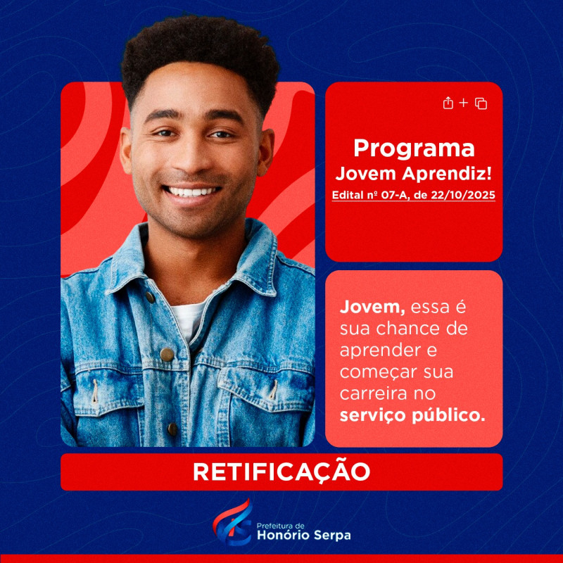 A Prefeitura Municipal de Honório Serpa informa que foi publicado o Edital nº 07-I/2025, que retifica a classificação final do Processo Seletivo do Programa Jovem Aprendiz.
