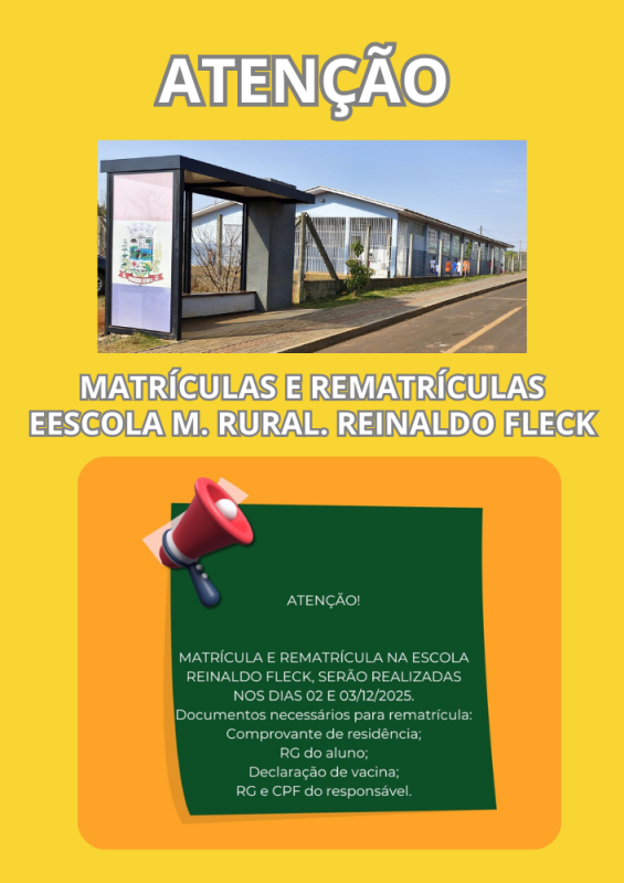 Atenção pais ou responsáveis por alunos que irão estudar na Escola Municipal Rural Reinaldo Fleck do Distrito Pinho Fleck: As matrículas estarão disponíveis na terça e quarta-feira, ou seja, 2 e 3 de dezembro, nas dependências da escola.